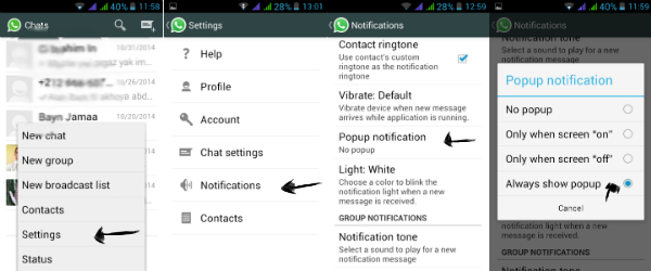 في الاندرويد: تذهب إلى الاعدادات وتختار “الإخطارات “Notification ثم “الإخطارات المنبثقة “Popup notification ثم تختار Always show popup.