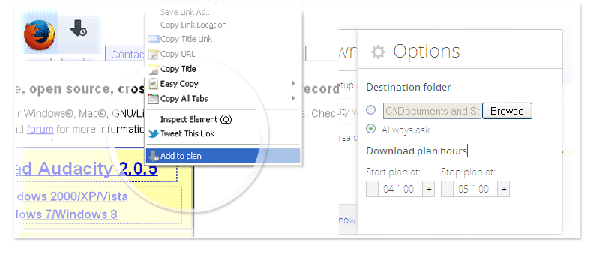 هناك العديد من البرامج وكذلك الإضافات التي تقوم من خلالها بإدارة كل ما تقوم بتحميله من شبكة الانترنت ،طبعا هذا النوع من الإضافات توفر المزيد من الخيارات على مدير التحميلات الافتراضي للمتصفح، في متصفح فايرفوكس توجد إضافة Download Plan تقوم من خلالها بتحديد أوقات معينة في اليوم لبدء التحميل تلقائيا.