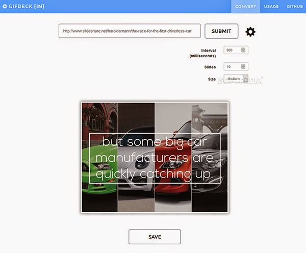 هذه الخدمة ستمكنك من تحويل عروضك التقيديمية إلى صور متحركة (GIF) افتراضيا، سيتم تحويل الشرائح العشرة الأولى على الرغم من أنك يمكن أن تزيد هذا العدد ليشمل أكثر إذا كنت في حاجة إليها. يمكن حفظ GIF كصورة نهائي في حاسوبك ويمكن أن تستخدمها بالطريقة التي تريدها.