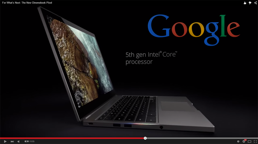 هذا مقطع الفيديو الأول الذي تكشف فيه جووجل عن الشكل و الهيكل والتصميم الجذاب لحاسوب “كروم بوك بيكسل” الجديد الذي يمتاز بشاشة لمس عالية الدقة ولوحة تحكم زجاجية.